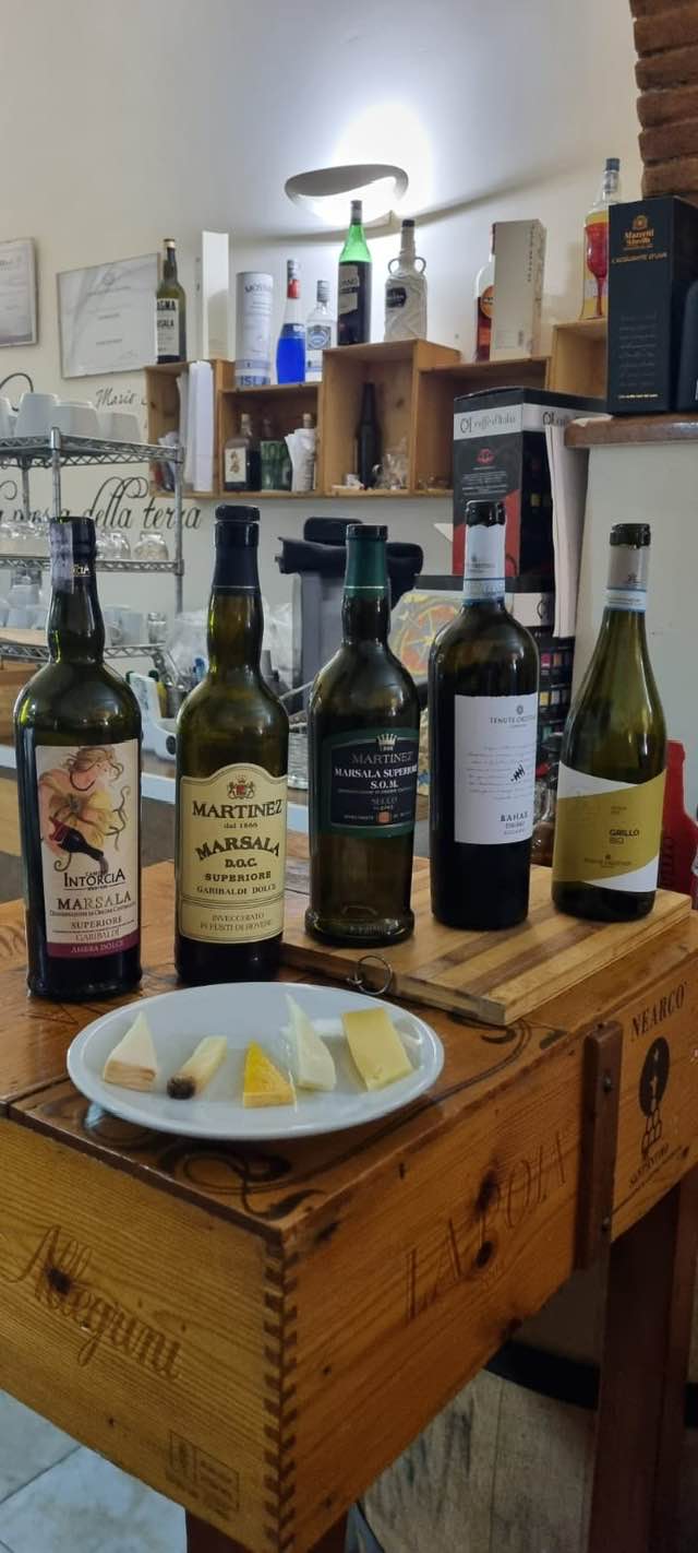 Formaggi accompagnati da altrettanti vini Siciliani, tra cui il Marsala DOC, per continuare con pasta alla Norma e un dolce alla ricotta di pecora e uva sultanina...e non può mancare il Passito di Pantelleria!
