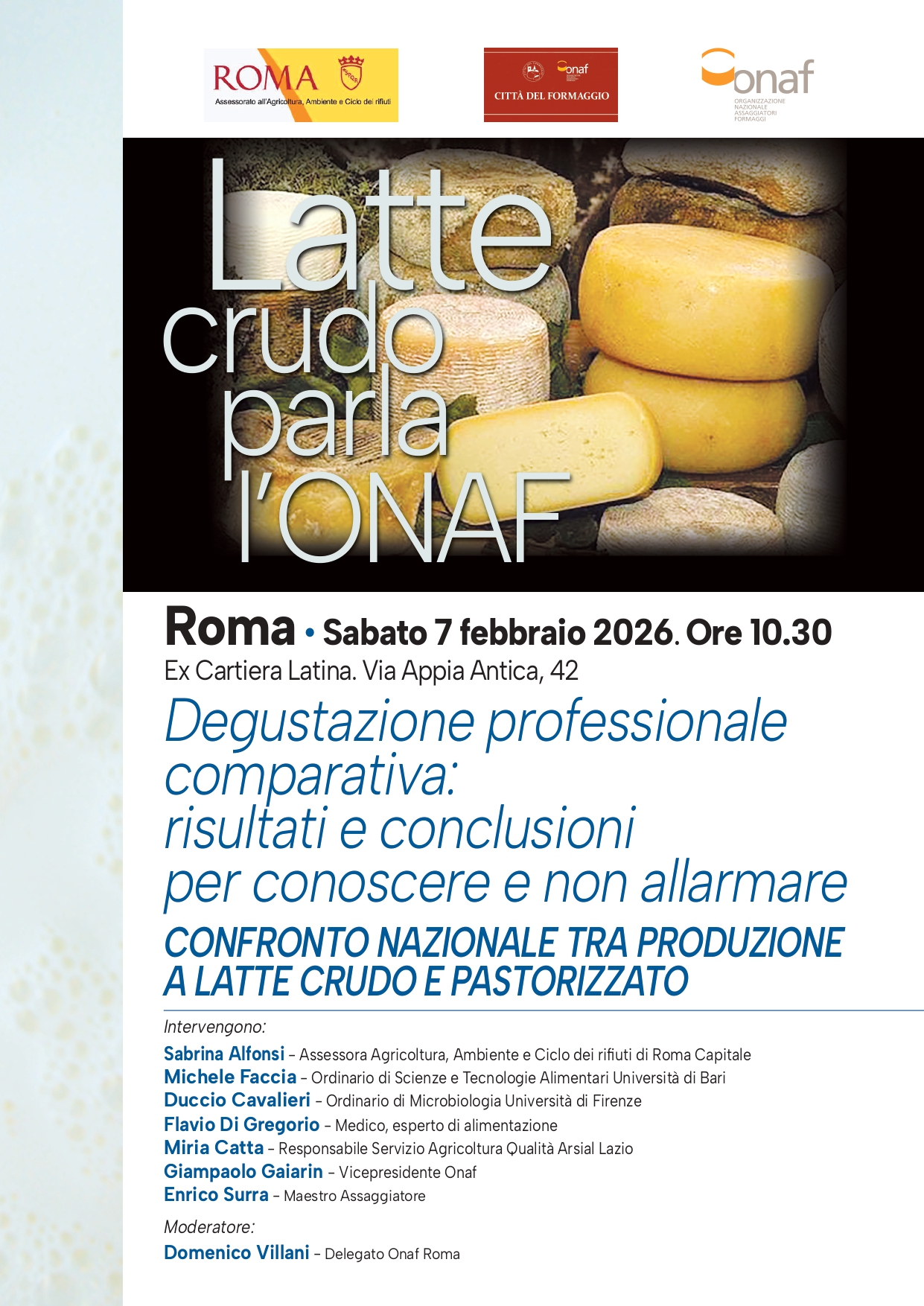 Il presidente dell’Onaf Pier Carlo Adami afferma che “Partire da una rigorosa analisi sensoriale per giungere a conclusioni più vaste è l’atteggiamento che l’Onaf propugna da oltre trent’anni con assoluta credibilità. L’incontro potrà essere di grande utilità alla realtà casearia nazionale con conclusioni che giungeranno per conoscere senza allarmare”.