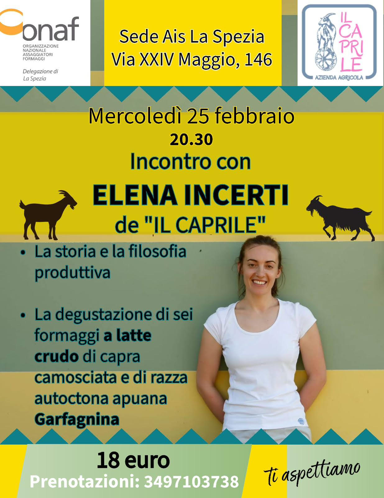 Elena Incerti, giovane allevatrice carrarese, dopo aver conseguito la laurea in Scienze delle Produzioni Animali, ha fondato, una decina di anni fa, l'Azienda "Il Caprile", attuando uno stile di vita in controtendenza, lontano dallo strerss cittadino e a contatto con la natura.